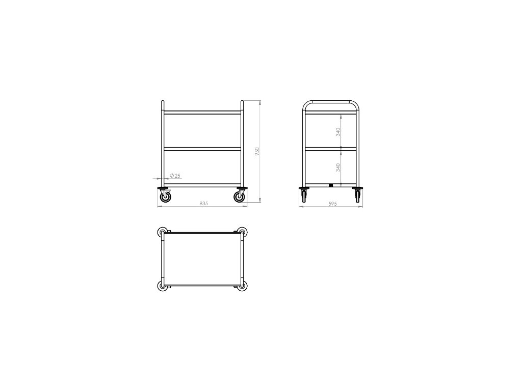 Servírovací vozíky z chromíkové oceli 18/10. Konstrukce je z nerezových profilů a broušeného plechu. Konstrukce z ohýbaných trubek.Kolečka: prům. 100 mm, 4 otočná z toho 2 s brzdou